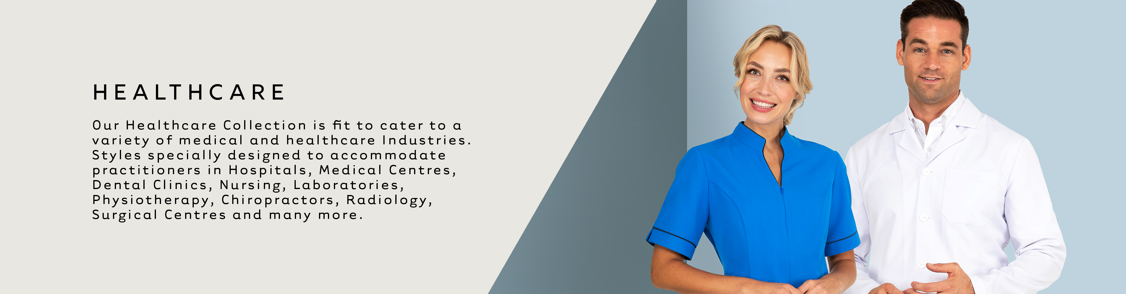 Our Healthcare Collection is fit to cater to a variety of medical and healthcare Industries. Styles specially designed to accommodate practitioners in Hospital, Medical Centres, Dental Clinics, Nursing, Laboratories, Physiotherapy, Chiropractors, Radiology, Surgical Centres and many more.